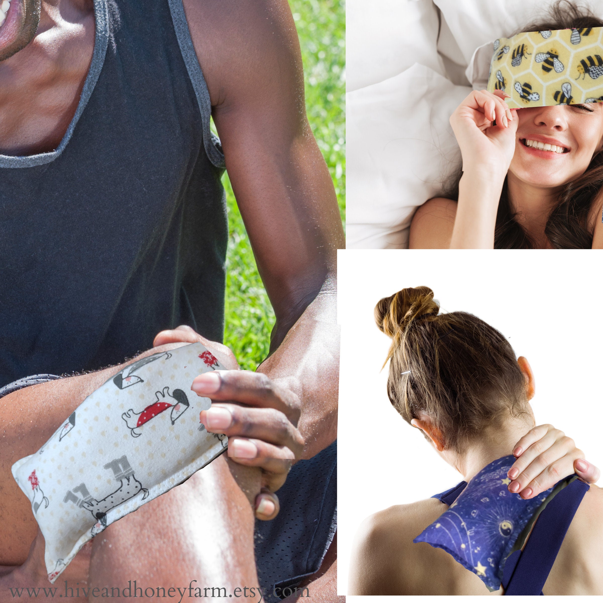Keeps you warm during the winter, cool in the summer and soothes aches, pains, sprains and bruises. Great for use on your forehead, neck, shoulder, wrists, elbows, tummy, back, knees, ankles, feet, anywhere you would use a heating pad or cold pack.